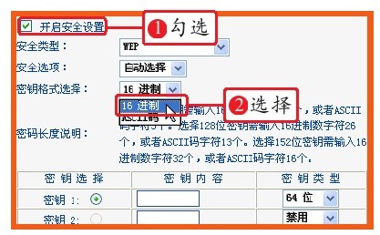 勾选“开启安全设置”复选框。单击“密钥格式选择”选项右侧的下三角按钮,在展开的下拉列表中选择“16进制”选项。