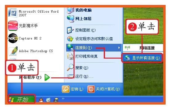 在安装无线网卡的电脑上单击“开始”按钮,在弹出的菜单中依次单击“连接到>显示所有连接”命令。