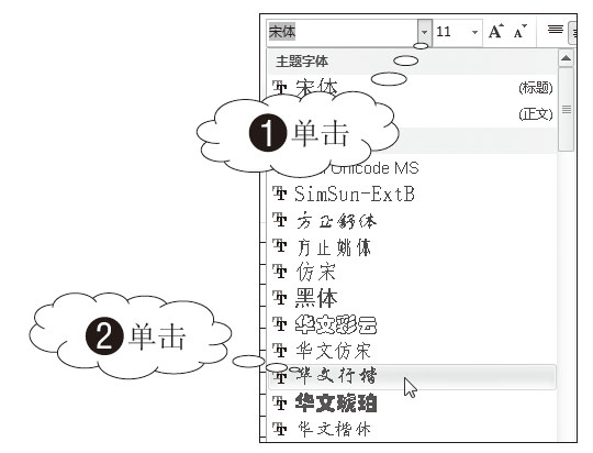02 选择字体。1 单击“字体”下三角按钮,2 从展开的下拉列表中单击“华文行楷”,如图3-78所示。
