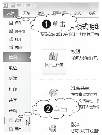 01 单击“选项”命令。1 在Excel窗口单击“文件”菜单,2 然后单击“选项”命令,如图3-95所示。