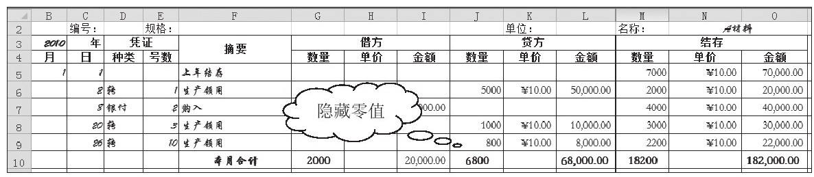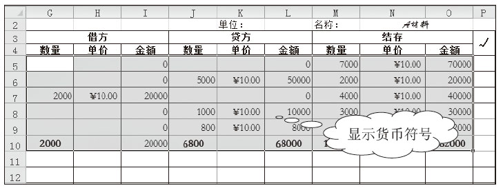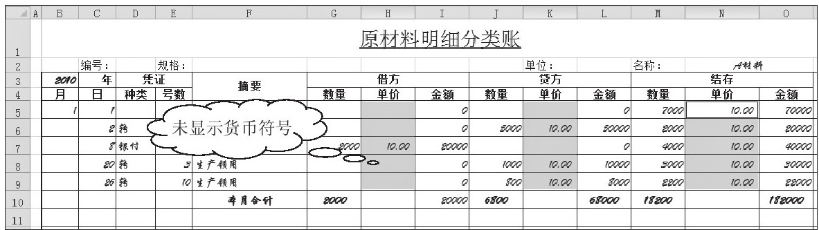 “数量金额式”明细分类账的账页,其基本格式为“收入”、“发出”和“结存”三栏,在这些栏内再分别设有“数量”、“单价”、“金额”等项,以分别登记实物的数量和金额。这种格式的明细账适用于既要进行金额明细核算,又要进行数量明细核算的财产物资项目,如“原材料”、“产成品”等账户的明细核算。本节将以“原材料”明细账为例,详细介绍使用Excel 2010并设置数字格式。请打开“附书光盘\实例文件\第3章\原始文件\数量金额式明细账.xlsx”工作簿。