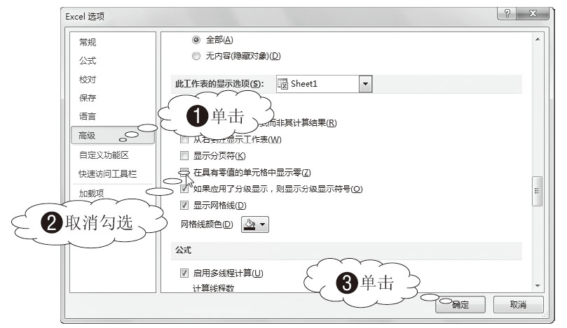 02 设置隐藏零值。在“Excel选项”对话框中,1 单击“高级”标签,2 在“此工作表的显示选项”区域取消勾选“在具有零值的单元格中显示零”复选框,3 然后单击“确定”按钮,如图3-96所示。