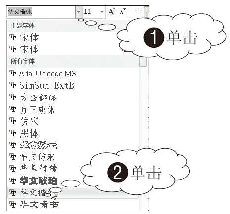 04 更改字体。1 再次单击“字体”下三角按钮,2 从下拉列表中选择“华文楷体”,如图3-90所示。