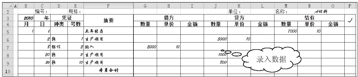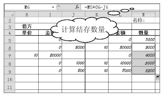 对于可以使用公式计算得到的项目,可以设置公式自动计算。比如,借、贷、结存三栏的金额和结存栏的数量都可以通过计算得到。