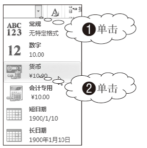 02 选择数字格式。1 在“数字”组单击“数字格式”下三角按钮,2 从展开的下拉列表中单击“货币”选项,如图3-88所示。