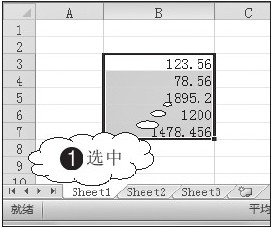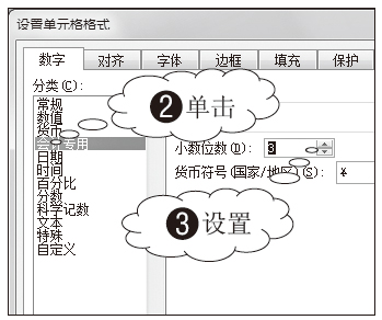 1 在单元格中输入一组数据并选择该组数据所在的单元格区域,此时数据会自动靠右对齐,如图3-98所示。打开“设置单元格格式”对话框,2 在“数字”选项卡中单击“会计专用”标签,3 设置“小数位数”为“3”,如图3-99所示。单击“确定”按钮,返回工作表中,设置为“会计专用”格式后的数据如图3-100所示,此时数据自动按货币符号和小数点对齐。