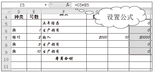 01 设置公式计算借方金额。在单元格I5中输入公式"=G5*H5",按下【Enter】键后,拖动单元格I5右下角的填充柄复制公式至单元格I9,得到如图3-80所示的数据。