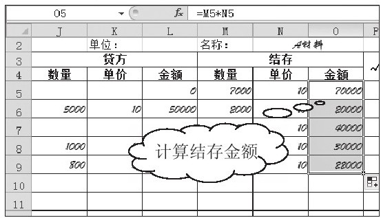04 设置公式计算结存金额。在单元格O5中输入公式"=M5*N5",按下【Enter】键后,拖动单元格O6右下角的填充柄复制公式至单元格O9,如图3-83所示。