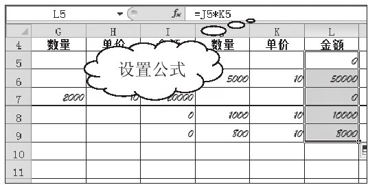 02 设置公式计算贷方金额。在单元格L5中输入公式"=J5*K5",按下【Enter】键后,拖动单元格L5右下角的填充柄复制公式至单元格L9,得到如图3-81所示的数据。