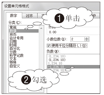 02 设置数字格式。打开“设置单元格格式”对话框,1 单击“数值”标签,2 勾选“使用千位分隔符”复选框,其余保留默认设置,如图3-93所示。