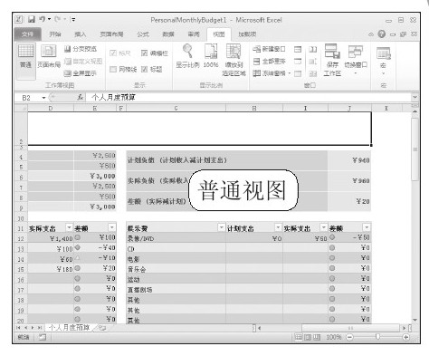 普通视图:此视图是Excel默认的工作簿视图,适用于工作表中数据的输入和编辑,如下右图所示。