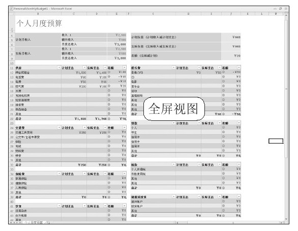 全屏视图:Excel 2010全屏视图是一个优化的视图,便于在计算机屏幕上查看工作表内容。在全屏视图中,用户可以以全屏模式查看工作簿,如下左图所示。