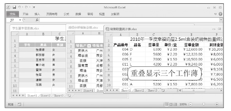 STEP 04:在窗口中同时显示多个工作簿。打开第三个工作簿,同样将其窗口进行还原,此时可以看到在一个窗口中同时显示了多个工作簿,如下右图所示。