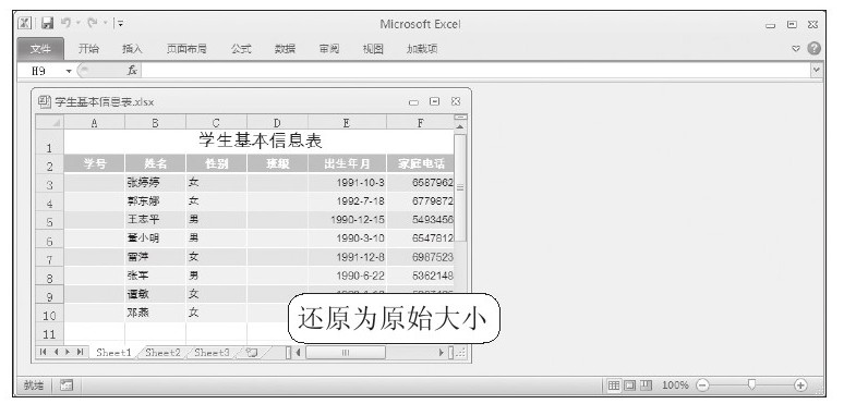 STEP 02:还原窗口后的效果。此时,可以看到“学生基本信息表.xlsx”成为了一个单独的窗口,并缩小显示,如下右图所示。