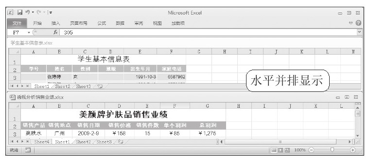 STEP 03:水平并排效果。单击“确定”按钮,此时可以看到打开的两个工作簿水平并行排列,效果如下左图所示。