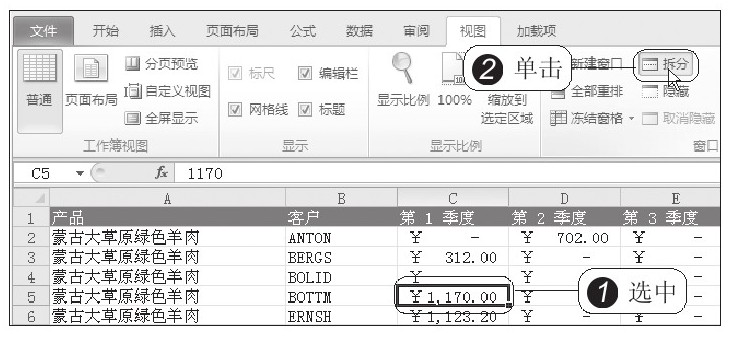 STEP 01:启动“拆分”功能。打开“实例文件\第2章\原始文件\销售报表.xlsx”,选中要拆分分隔处的单元格,该单元格的左上角就是拆分的分隔点,例如选中C5单元格,然后在“视图”选项卡下单击“拆分”按钮,如下左图所示。