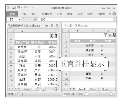STEP 04:垂直并排效果。若用户在“重排窗口”对话框中选中“垂直并排”单选按钮,那么两个工作簿将在垂直方向并行排列,效果如下右图所示。