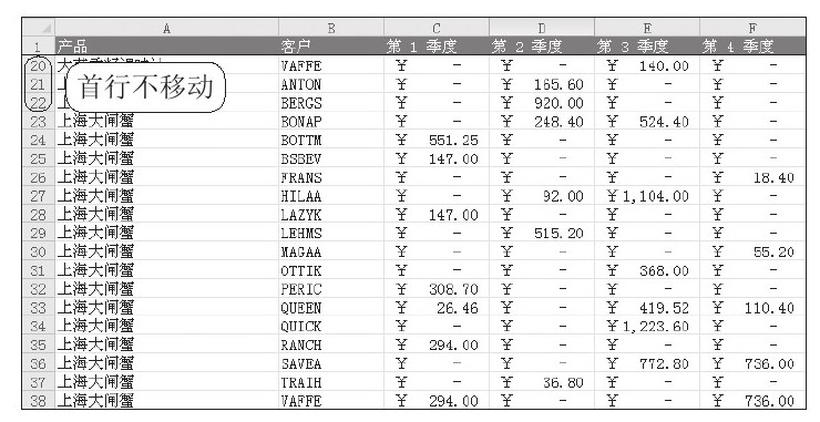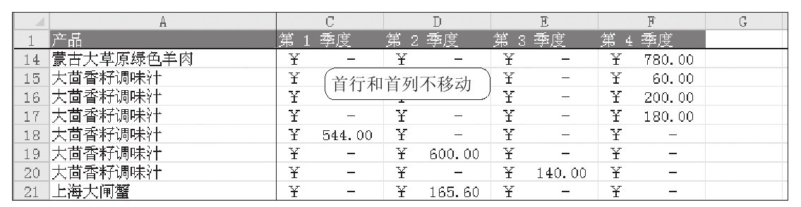 STEP 06:移动冻结后的工作表。此时,首行和首列同时被冻结了,拖动垂直滚动条和水平滚动条,可以看到首行和首列不会随之移动,如下图所示。