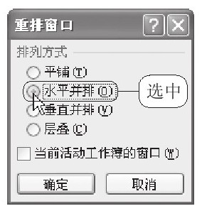 STEP 02:选择重排方式。弹出“重排窗口”对话框,在该对话框中选择重排的方式,例如选中“水平并排”单选按钮,如下右图所示。