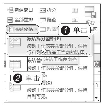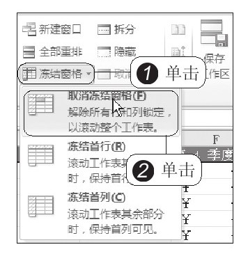 STEP 05:冻结拆分窗格。单击“冻结窗格”按钮,在展开的下拉菜单中单击“冻结拆分窗格”选项,如下右图所示。