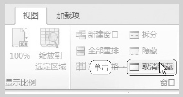 (3)取消隐藏工作簿。若要重新显示出工作簿,可在“视图”选项卡下单击“取消隐藏”按钮,如下左图所示。
