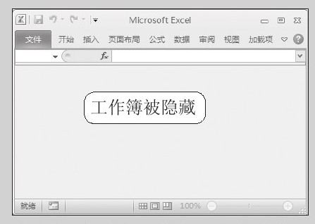 (2)隐藏工作簿后的效果。此时,当前活动的工作簿被隐藏,显示一个空白的窗口,如下右图所示。