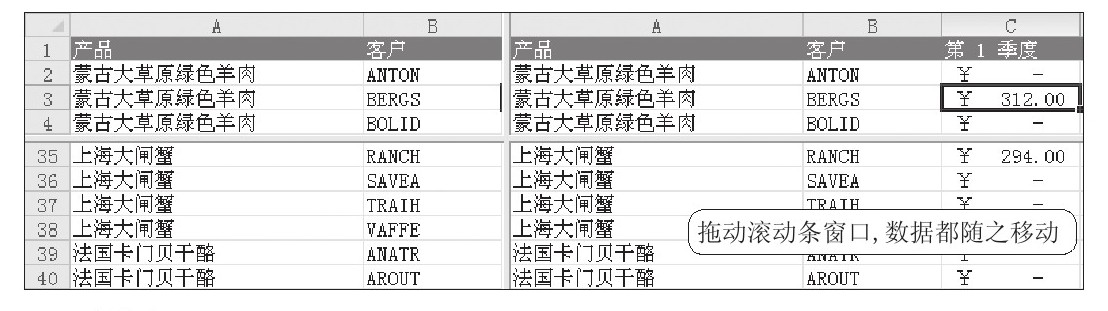 STEP 03:在拆分窗格中移动。此时拆分出的4个窗格都分别为一个独立的窗口,当用户拖动垂直或水平滚动条时,4个窗格中的数据都会随之滚动,如下图所示。
