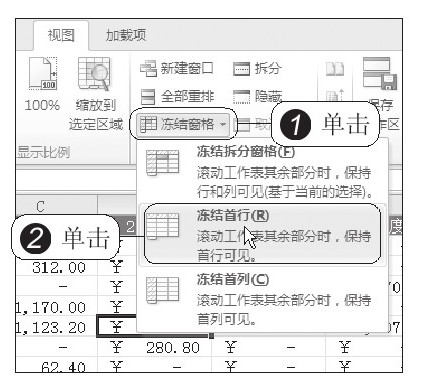 STEP 01:冻结首行。打开“实例文件\第2章\原始文件\销售报表.xlsx”,在“视图”选项卡下单击“冻结窗格”按钮,然后在展开的下拉菜单中单击“冻结首行”选项,如下左图所示。