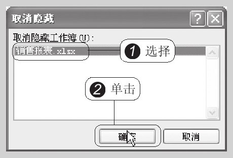 (4)选择取消隐藏的工作簿。弹出“取消隐藏”对话框,在“取消隐藏工作簿”列表框中选择要取消隐藏的工作簿,然后单击“确定”按钮,即可重新显示出隐藏的工作簿,如下右图所示。