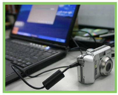在数码相机上插入相机配备的数据线,然后在启动的电脑上将数据线的另一端插入电脑USB接口,将相机与电脑连接。