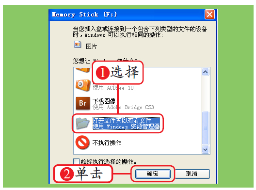 在电脑桌面上弹出的对话框中选择“打开文件夹以查看文件”选项,然后单击“确定”按钮,即可以文件夹的形式打开存储卡中的照片。