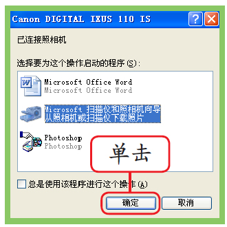 在电脑桌面上弹出的对话框中选择“Microsoft扫描仪和照相机向导”选项,然后单击“确定”按钮。