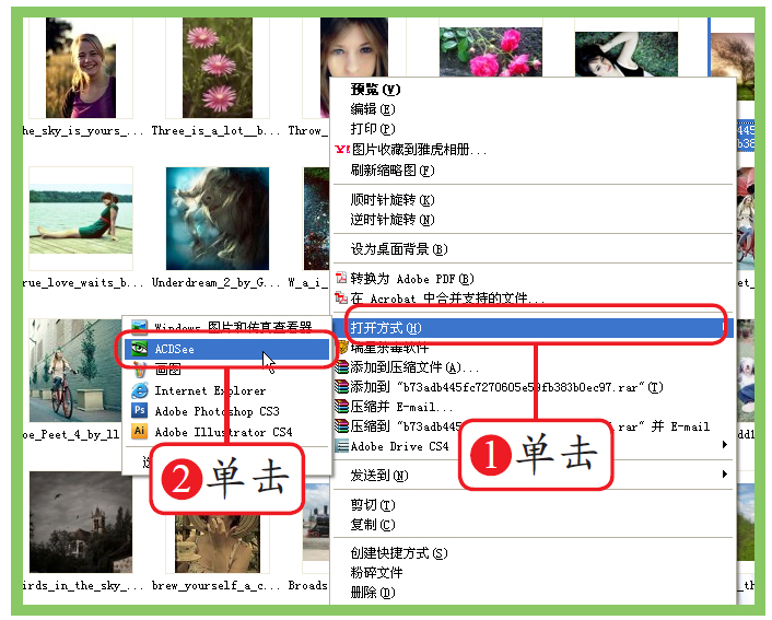 右击需要查看的照片,在弹出的快捷菜单中单击“打开方式”命令,然后在弹出的子菜单中单击ACDSee选项。