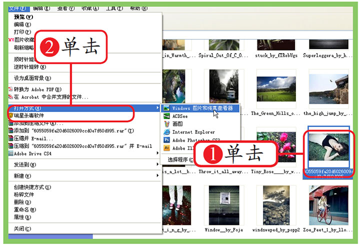 在电脑中打开照片文件夹,单击选中需要查看的照片后,执行“文件>打开方式>Windows图片和传真查看器”菜单命令。