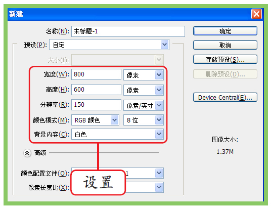 通过文件菜单中的第一个命令“新建”,即可新建一个空白文件,在打开的“新建”对话框中,可设置文件的名称、大小、分辨率、背景色等。下面介绍新建文件的具体操作步骤。