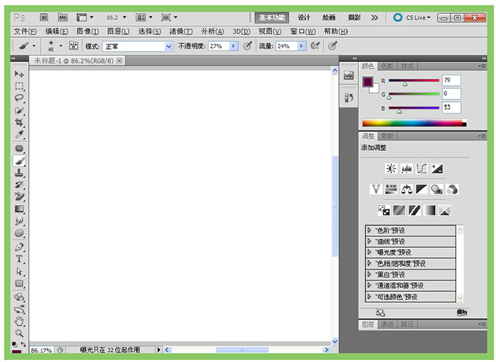经过上一步骤中“新建”对话框中的设置,在图像窗口中创建了一个800像素×600像素大小的空白文件。