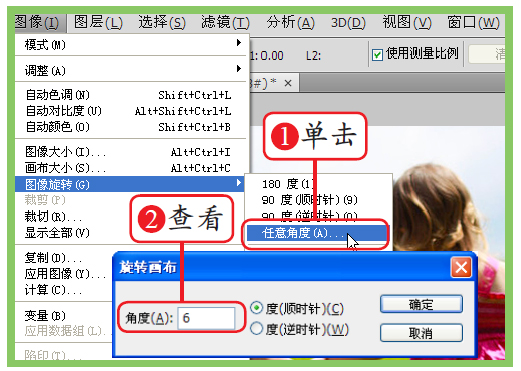 执行“图像>图像旋转>任意角度”菜单命令,打开“旋转画布”对话框,在对话框中输入角度为6,并选中“度(顺时针)”单选按钮。