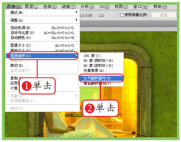 打开随书光盘\素材\5\6.jpg素材文件,执行“图像>图像旋转>水平翻转画布”菜单命令。