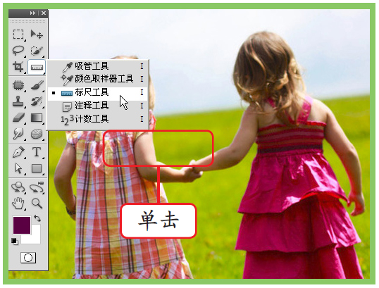 打开随书光盘\素材\5\7.jpg素材文件,将工具箱中“吸管工具”下的隐藏工具选项打开,选择“标尺工具”