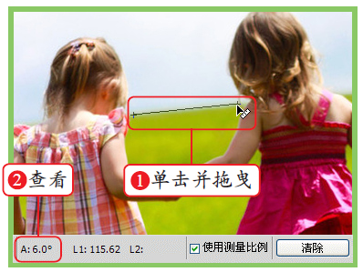 在图像中倾斜的草地边缘上单击并拖曳,创建一条相同的倾斜线段,在选项栏中可以看到"A:6.0°"表示线段的倾斜角度。