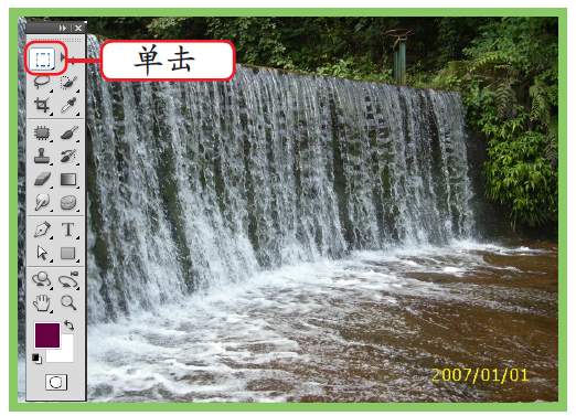 执行“文件>打开”菜单命令,打开随书光盘\素材\4\8.jpg素材文件,在工具箱中单击选择第一个工具“矩形选框工具”按钮