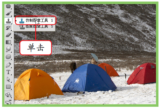 选择“背景副本”图层,单击工具箱中的“仿制图章工具”按钮