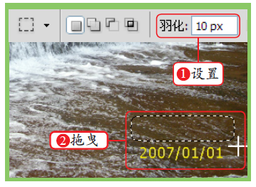 在选项栏中设置“羽化”选项为10px。使用“矩形选框工具”