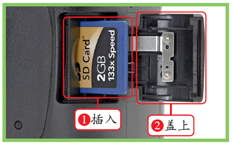 将存储卡正面朝内,插入存储卡槽,再盖上存储卡槽盖。