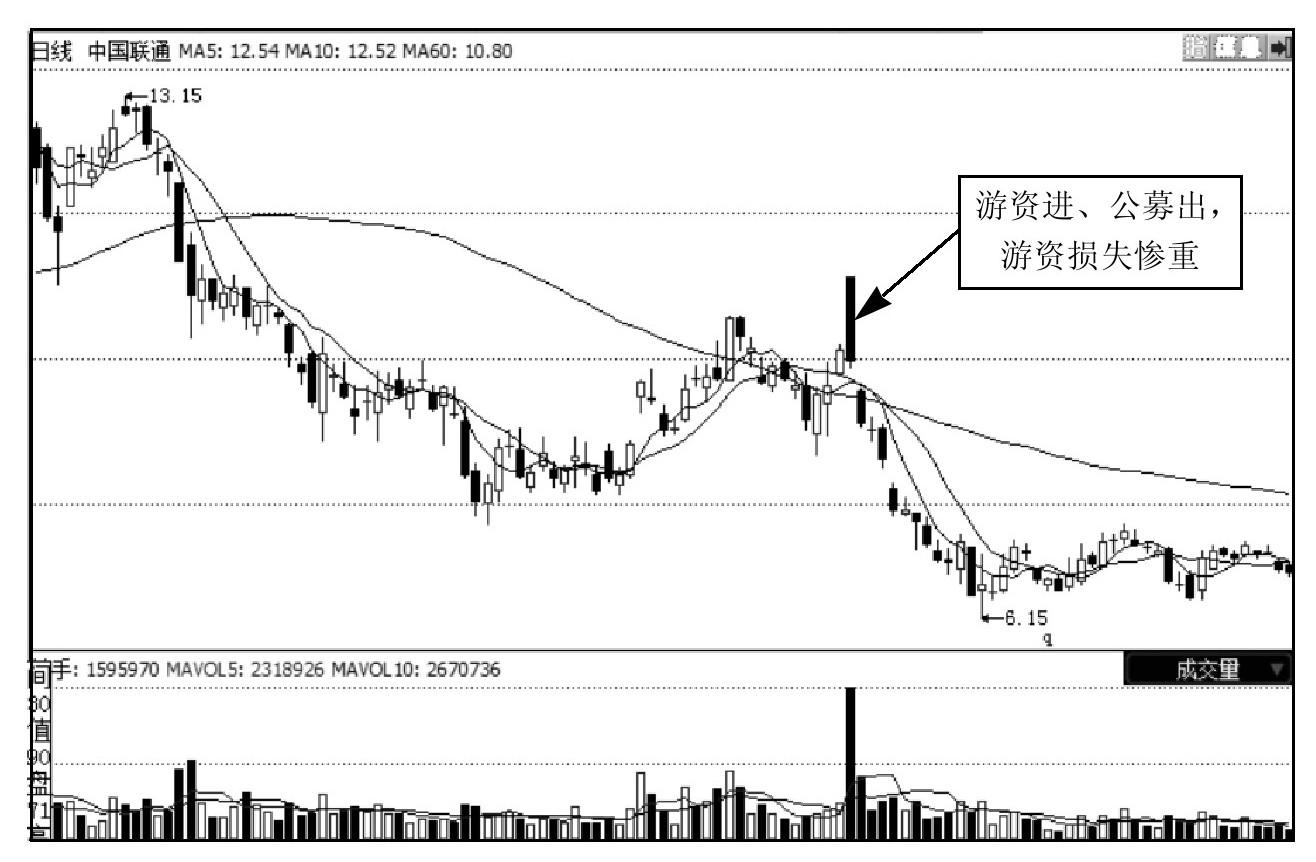 代表战役:2008年6月3日,中国联通因重大事项复牌,此则消息是一则利好,当日大幅高开,市场中的游资私募本来准备炒作中国联通这只股票,无奈重兵屯集在中国联通的公募基金趁机出货,当日吸筹的私募游资在该股中损失惨重,如图1-7所示。经此一战,在以后一段时间里,只要是公募基金重仓的股票游资基本不再涉足。