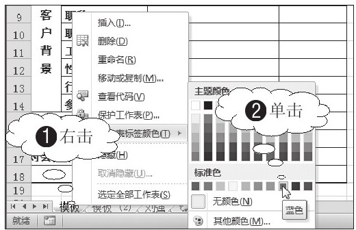 为了突出与区别工作表标签,可以为工作表标签设置不同的颜色,突出工作表名称,例如将“模板”工作表标签设置为蓝色。