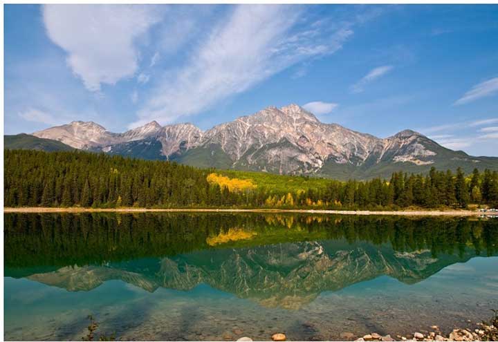 对这幅照片而言,其正面角度是相对的,即在湖面刚好能够呈现大山倒影的位置进行拍摄,从而形成上下对称式的构图,整体给人均衡、稳重的视觉感受。