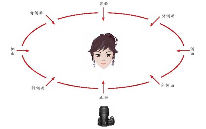拍摄方向一般包括以下5个方位,即正面、斜侧面、侧面、背侧面、背面。