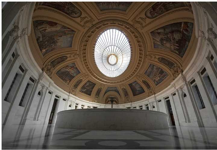 从建筑的内部正面拍摄,可以反映建筑的全貌,由于该建筑内部的对称性,整体给人以庄严、稳重的感受。