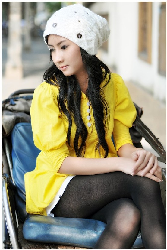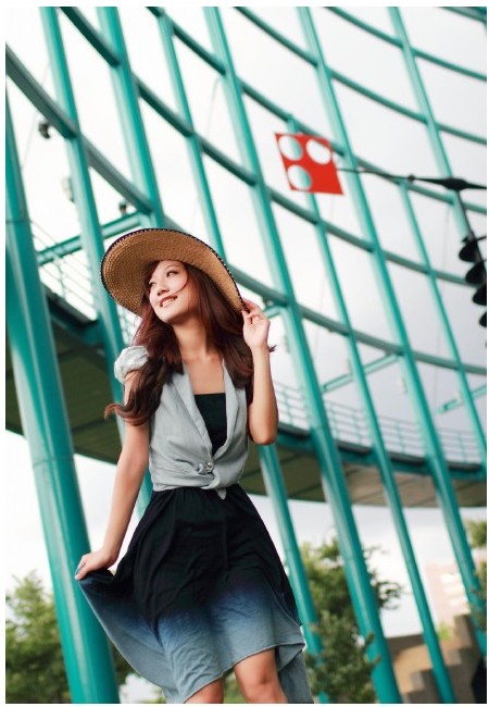 采用仰视角度拍摄极为有效地摆脱了较为繁复的环境背景,同时还将人物身材衬托得十分高挑,而微微倾斜镜头的拍摄则使画面更具动感效果。